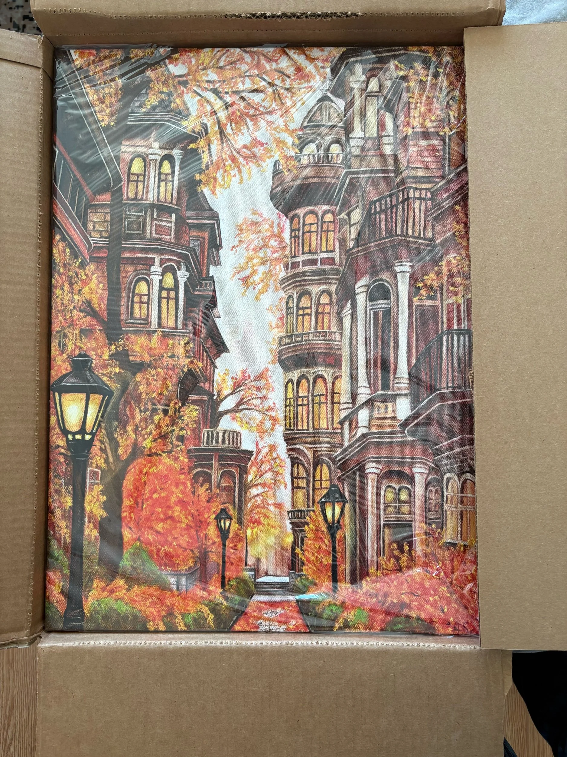 This piece captures a quiet city street bathed in the glow of lantern light and framed by ornate old buildings and fiery foliage. The air feels crisp, the leaves whisper underfoot, and the world seems to slow just long enough for you to breathe it all in.